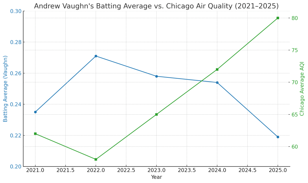 But maybe it wasn’t just mechanics or genetics weighing him down. Maybe it was something bigger—something in the air. During his time in Chicago, Vaughn’s batting average followed a strikingly similar trend to the city’s air quality. With a correlation coefficient of –0.71, the data suggests a moderately strong inverse relationship: as the air worsened, so did the swing.